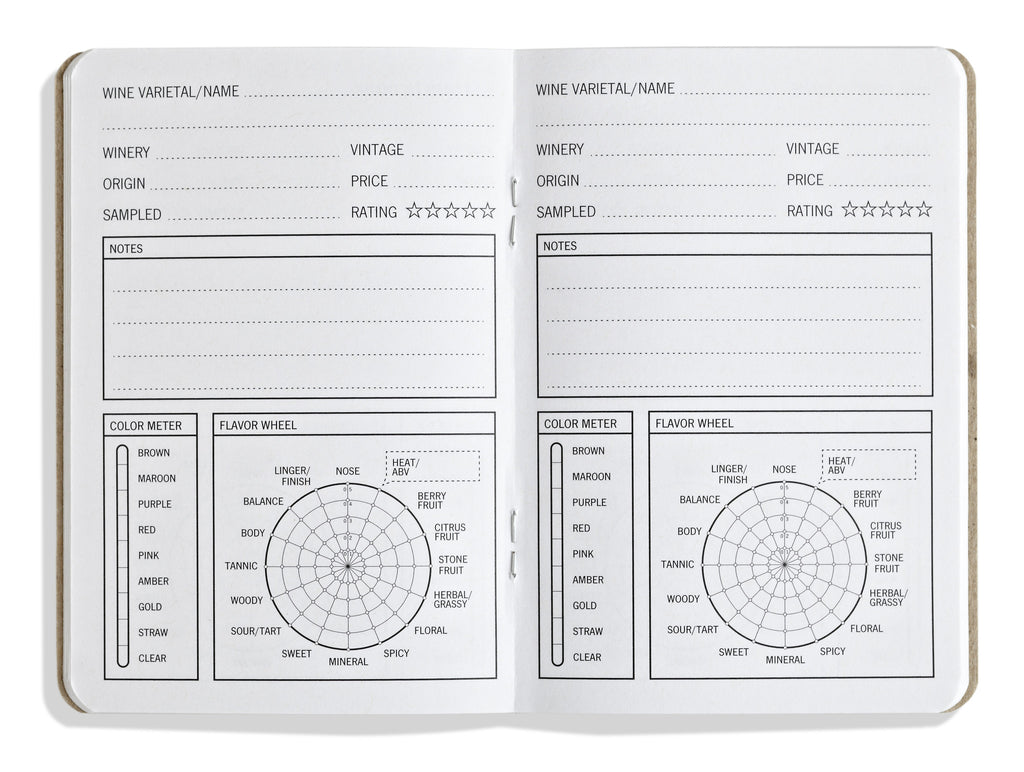 As with the standard 33 Wines, the flavor wheel on each interior page can be used to quickly recall a wine’s unique flavor long after consumption. For low values of the flavor, fill in dots near the wheel’s center.