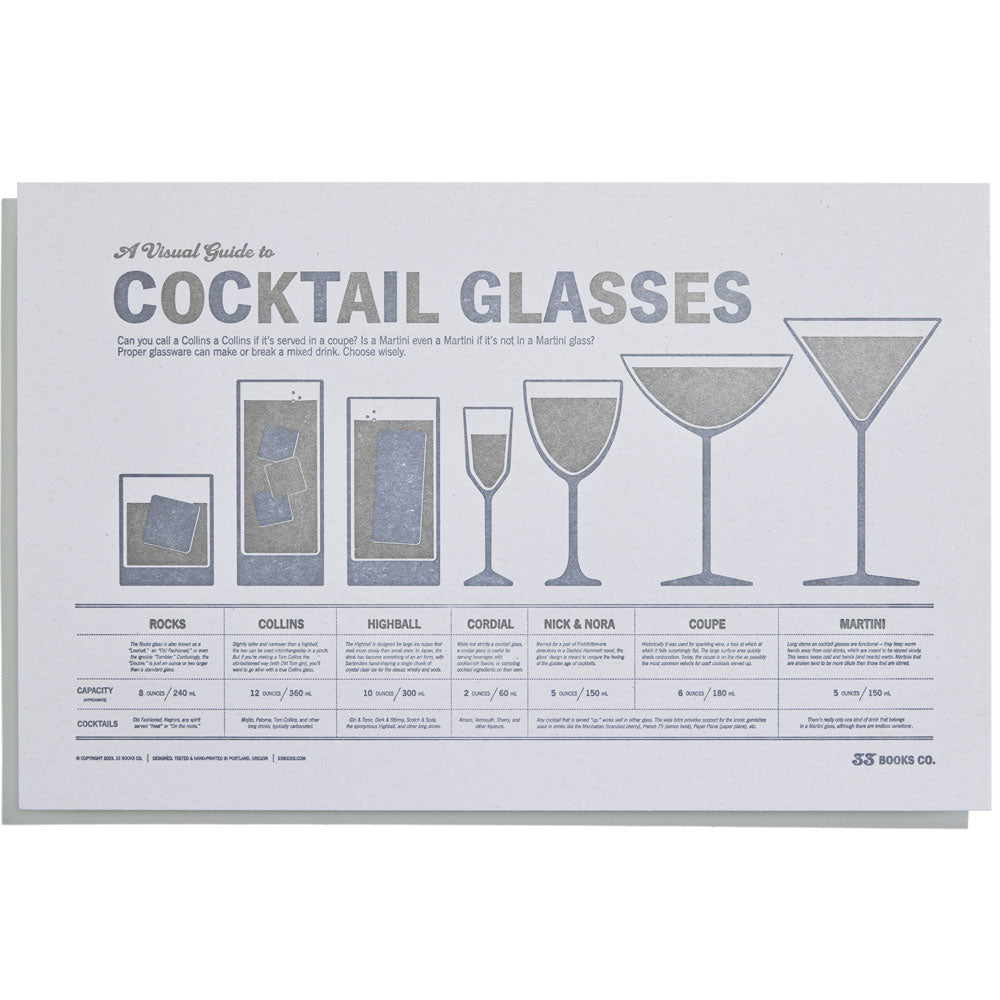 A Visual Guide to Cocktail Glasses is an easily-frameable 11 x 17 inch (28 x 73 cm) guide to seven classic cocktail glasses, distilled into a simple, attractive print that's perfect for hanging in your home bar or kitchen.