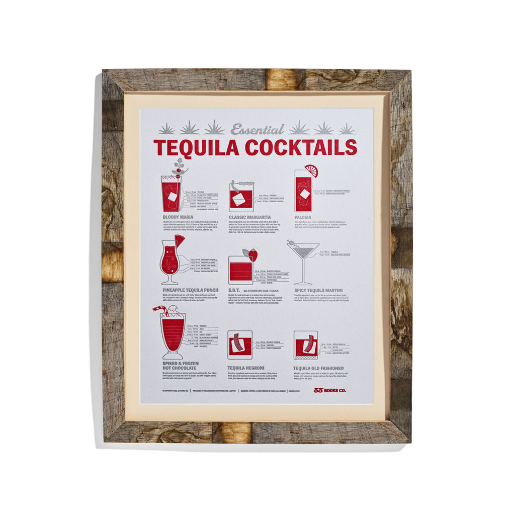 Essential Tequila Cocktails is a frameable* 11 x 14 inch (28 x 36 cm) guide to creating nine essential tequila cocktails, distilled into a simple, attractive print that's perfect for hanging in your home bar, cantina or tequileria. Its two-color design in bright red and metallic silver shines just about anywhere.