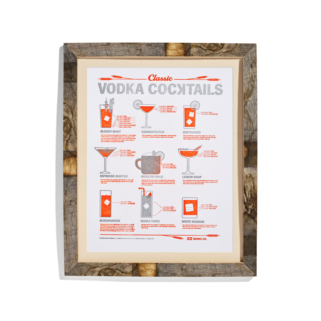 Classic Vodka Cocktails celebrates vodka in a frameable* 11 x 14 inch (28 x 36 cm) guide to creating nine classic vodka cocktails, distilled into a simple, attractive print that's perfect for hanging in your home bar, cocktail den, dacha, or kitchen.