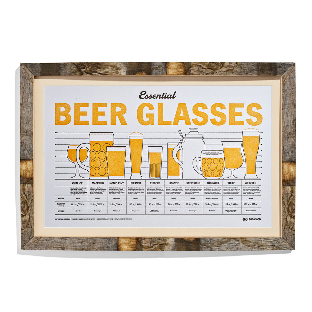 Essential Beer Glassware explains it all in a frameable 12 x 18 inch letterpress print (31 x 46 cm) perfect for hanging in your brewery or bar. It features ten essential glasses, listing their origins, volumes, and a brief bit of history, as well as the beer styles they are designed for. It makes an attractive print for any beer lover, and looks great on the wall in a kitchen, barrel room or bar.