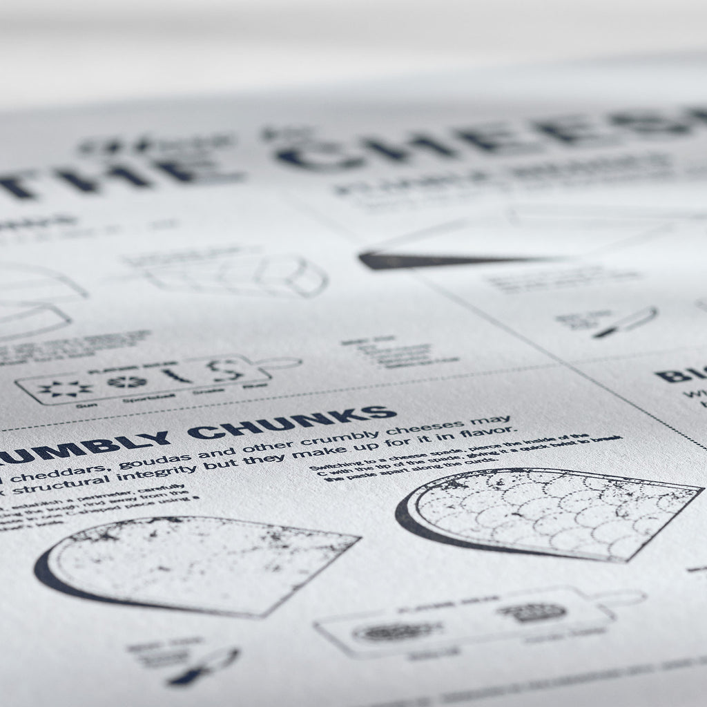 How to Cut the Cheese is a frameable 11 x 14 inches (28 x 36 cm), perfect for hanging in your cheese cave or kitchen. It demonstrates how to portion four of the most common cheese types into beautifully snackable, super-stackable portions for your next cheese board.