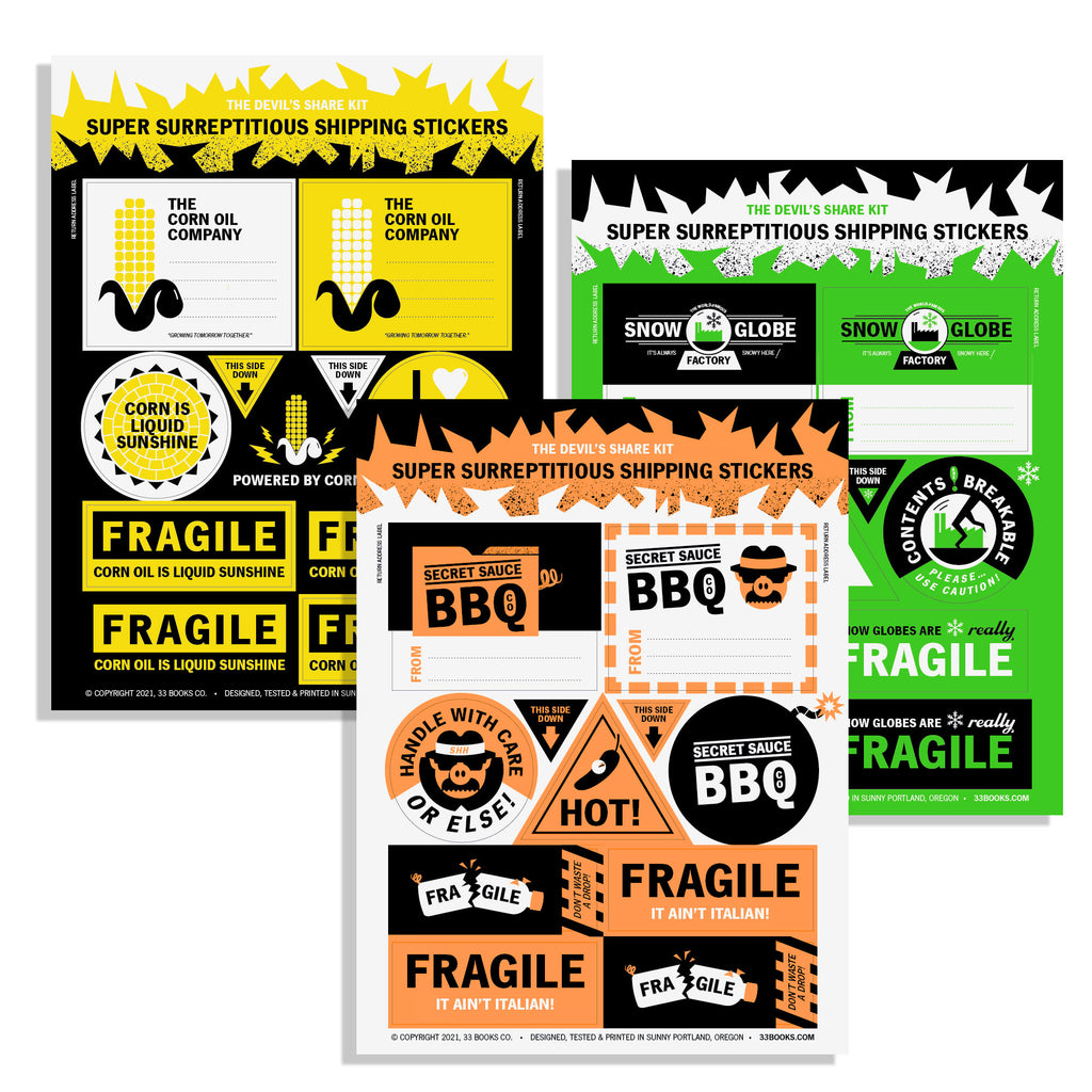 Three sheets (heh) of stickers are included, promoting the contents of your package as coming from either the "Secret Sauce BBQ Company," "The Corn Oil Company," or "The World-Famous Snow Globe Factory." There are 11 stickers per sheet, for a grand total of 33 stickers. The stickers are printed in sunny** Portland, Oregon with vibrant, neon ink on 100% recycled paper.