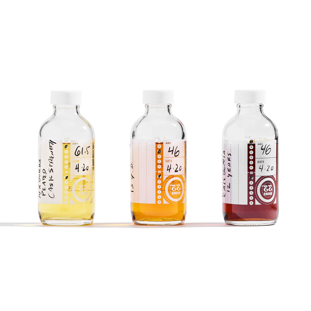 Each kit contains three (3) reusable 4 oz. / 120 mL, chemically-inert glass bottles, pre-printed in the USA at 10 mL and 1/2 oz. increments, sealed with a food-safe, BPA-free lid. A 33 Books Co. logo printed in white / reverse allows the recipient to evaluate the bottles' contents for clarity and color. Labels are also-pre-printed on the bottle, which can be written on with the included, USA-made grease* pen.