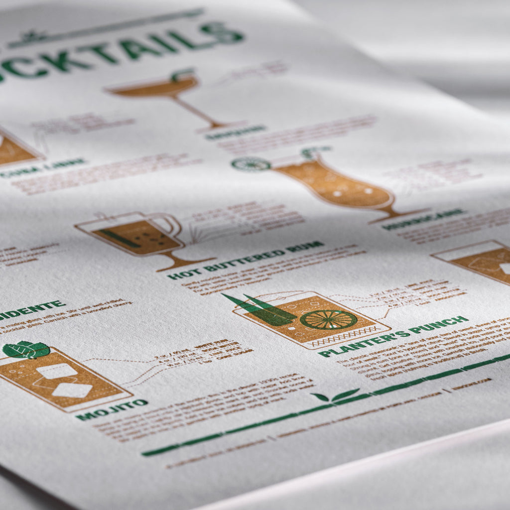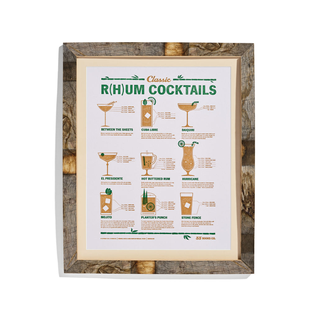 Classic R(h)um Cocktails celebrates rum in a frameable* 11 x 14 inch (28 x 36 cm) guide to creating nine classic rum cocktails, distilled into a simple, attractive print that's perfect for hanging in your cabana or kitchen.