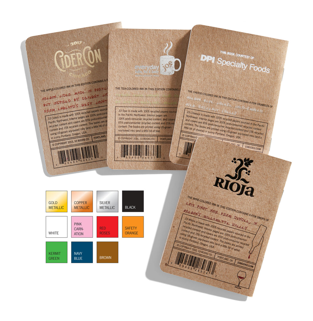 I get asked about personalized “33” books almost every day, which I take as a huge compliment. I’m honored when people want to make my pocket tasting notebooks part of their weddings, parties and other special occasions! My American-made, super awesome foil-stamping machine allows me to add artwork and text to the cover of my books, creating a unique set of books just for you in about a week.