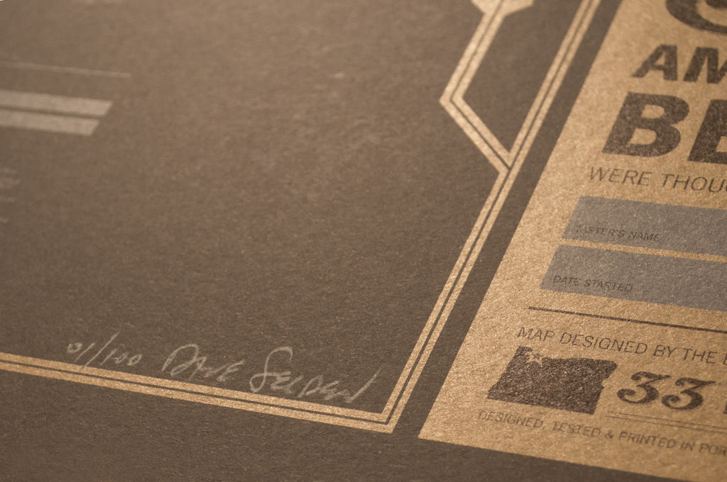 The poster is printed on 100% recycled, chlorine-free French brand paper, made in Niles, Michigan (about 100 miles south of one of my favorite Michigan breweries, Founder's). If you're as big a paper connoisseur as you are a beer connoisseur, you'll also want to know that it's 100# Dur-o-tone cover in tough Steel Grey. The poster was printed, designed and tested in sunny Portland, Oregon with soy-based inks.